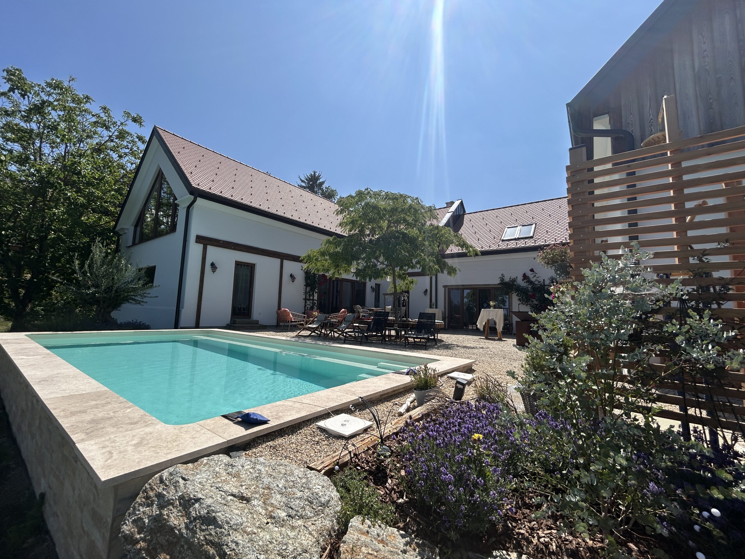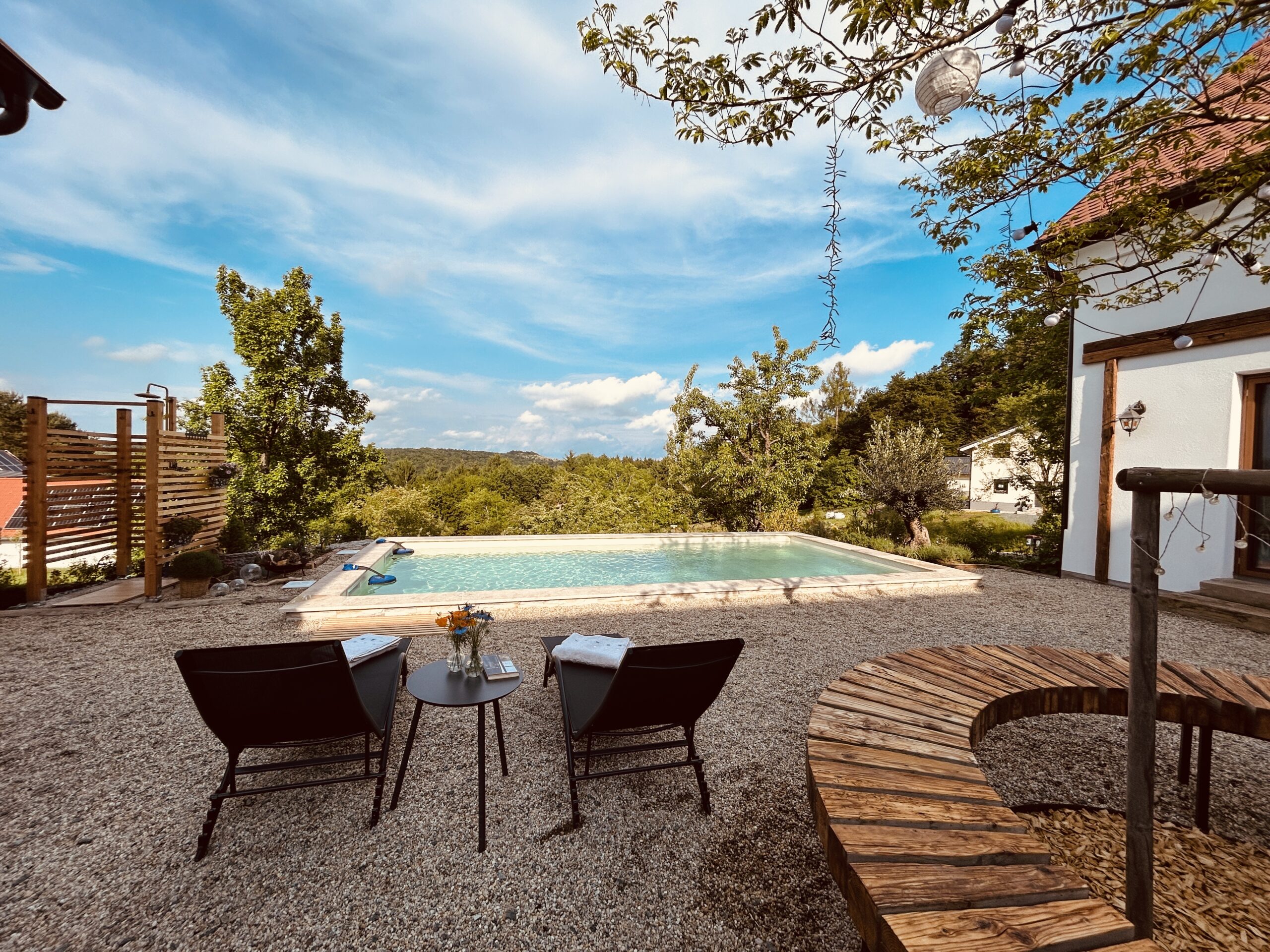 Unser Pool ist ein besonderer Rückzugsort an warmen Tagen. Eingebettet in den Hang und harmonisch in die Umgebung eingefügt, eröffnet sich von hier ein weiter Blick auf die umliegenden Wälder – ruhig, grün und entschleunigend.