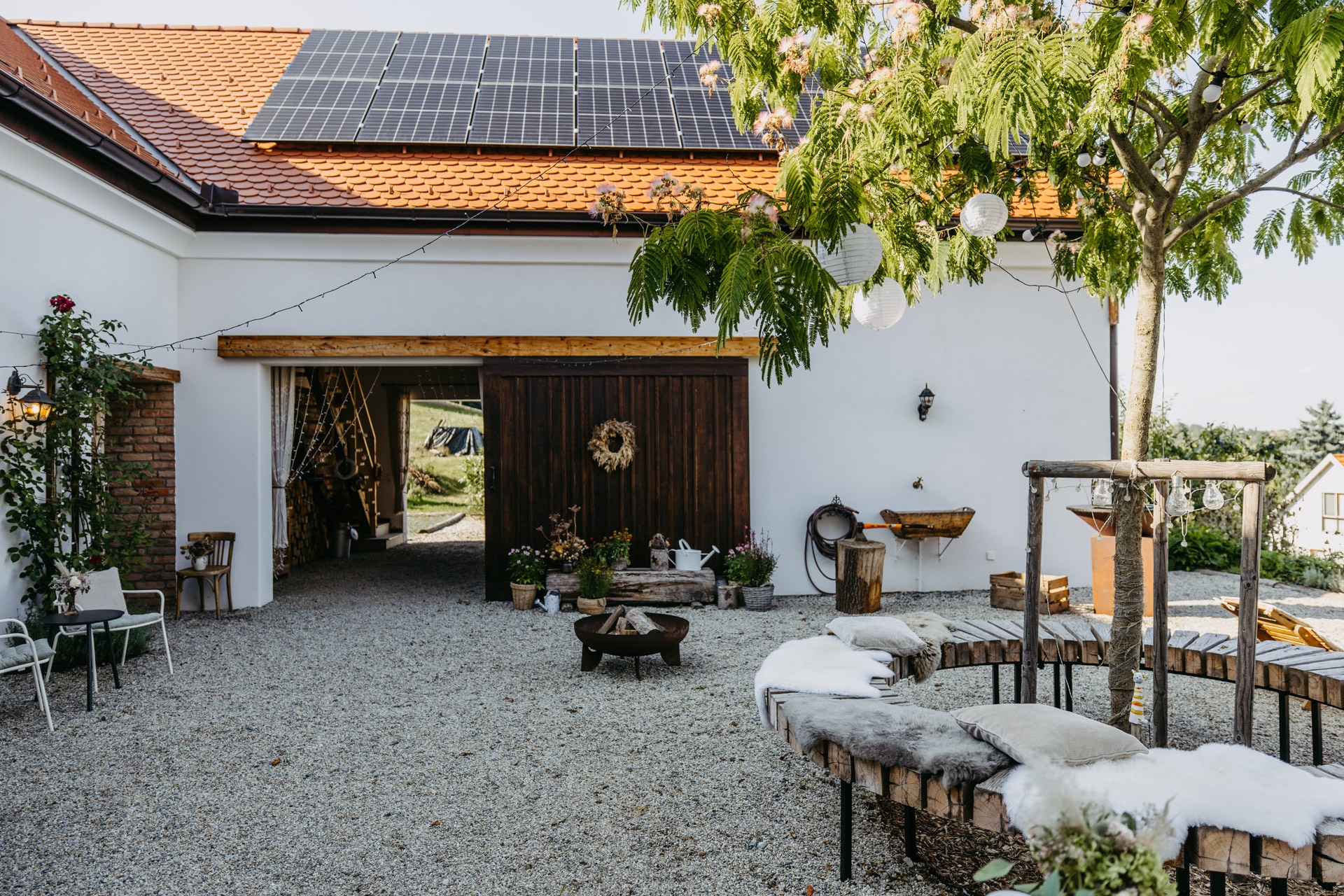 Der Innenhof ist das Herz unseres Hofes und ein Ort, an dem man gerne verweilt. Auf der großzügigen Holzterrasse lassen sich entspannte Stunden verbringen – ob bei einem Kaffee am Nachmittag oder bei einem Glas Wein an lauen Sommerabenden unter dem Sternenhimmel. Lichterketten tauchen den Hof in warmes Licht, während der Seidenbaum eine ganz besondere Atmosphäre schafft.
